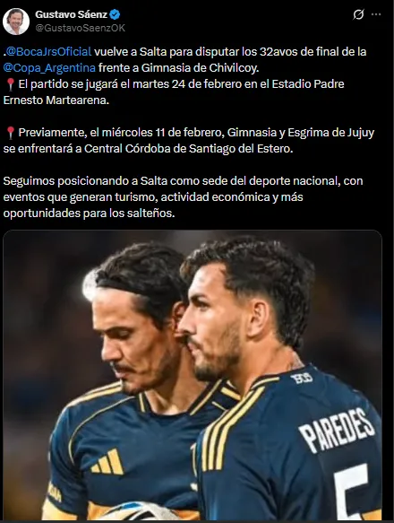 Según confirmó Gustavo Sáenz, Gobernador de Salta, el Xeneize enfrentará a Gimnasia de Chivilcoy en el Estadio Padre Martearena de esa provincia por los 32avos de final de la Copa Argentina el martes 24 de febrero.