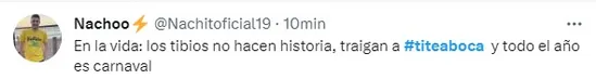 Otros rumores indican que Juan Román Riquelme está en tratativas por un nombre que no salió a la luz. Y en horas de la tarde, el periodista Martín Arévalo informó que Tite fue ofrecido al Xeneize. Esta noticia tuvo repercusión en las redes sociales y los hinchas se manifestaron de manera inmediata.