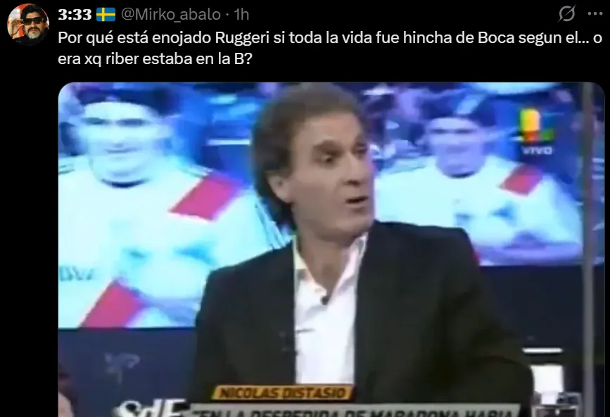 Al ver el fuerte enojo de Ruggeri por el Superclásico, los hinchas no dejaron pasar la oportunidad y en las redes le respondieron con todo. Algunos recordaron viejas frases suyas, donde aseguraba ser hincha del Único Grande: “¿Por qué está enojado Ruggeri? si siempre fue hincha de Boca según él… ¿O era porque River estaba en la B?”.