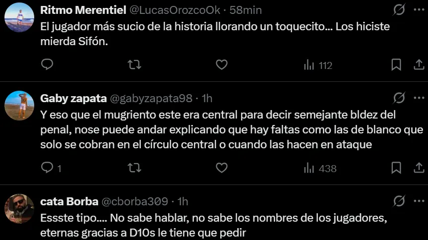 Otros directamente lo tildaron de mercenario y no ocultaron su felicidad al verlo molesto con lo sucedido en el Monumental. “Como se disfruta verlo llorar”, “El jugador más sucio de la historia llorando un toquecito”, “Pipipi y bueeeeno”, escribieron algunos en X (Twitter).