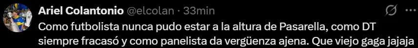 Al igual que con Ruggeri, los hinchas no perdieron la oportunidad y fueron durísimos contra el ex dirigente. “Tomate un avión para reclamar en el escritorio de Paraguay”, “Ladrón, a vos te dieron miles que no fueron, no tenés vergüenza”, escribieron y hasta le recordaron una vieja frase de Gallardo: “El que habla de los árbitros es porque quiere tapar lo que pasó en el partido”.