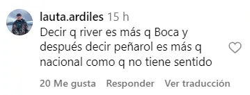 “Qué bueno es no tenerte en este lado de la vereda“, fue el comentario de una hincha del Xeneize que repitieron otros tantos simpatizantes. Otro fanático, un poco enojado y a modo de broma, agregó: “Decir que River es más que Boca y después decir que Peñarol es más que Nacional como que no tiene sentido“.