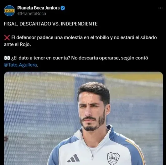 Según reveló el periodista Diego Monroig en ESPN, Nicolás Figal tiene una lesión en uno de sus tobillos y está descartado para el partido contra Independiente. Y además, agregó que el central viene jugando infiltrado los últimos 3 partidos del Xeneize.