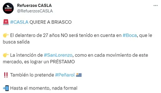 Uno de los que integra la lista es Norberto Briasco, quien está en el radar de Peñarol. Sin embargo, no es el único interesado. De acuerdo al dato que brindó la cuenta Refuerzos CASLA, San Lorenzo quiere al delantero de 27 años y resaltó que “la intención es lograr un préstamo”.