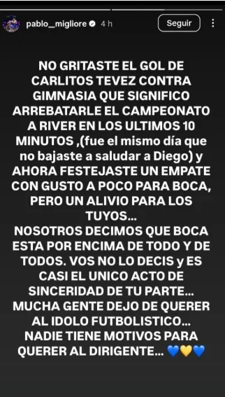 Lo cierto es que Migliore ya viene teniendo entre ceja y ceja a Riquelme a lo largo de estos meses complicados para la gestión. Pablo se expresó largo y tendido contra el presidente donde mostró su bronca por el presente del club. “Aunque nunca lo vayas a entender, Boca es más grande que vos, que tu hermano y todos los obsecuentes que te hacen creer lo contrario”, comenzó disparando.