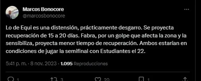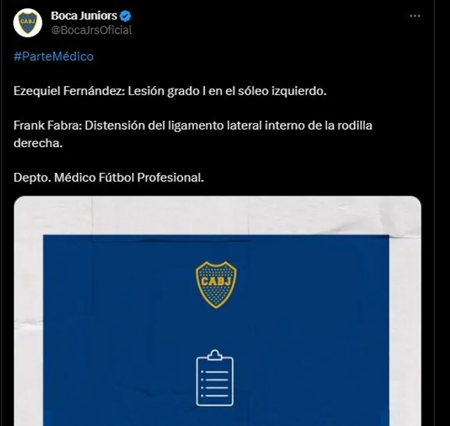 A partir del comunicado oficial de Boca, se dio a conocer que Frank Fabra sufrió la distensión del ligamento lateral interno de la rodilla derecha mientras que Equi tiene una lesión grado I en el sóleo izquierdo. Según informó Marcos Bonocore, el juvenil tendrá entre 15 a 20 días de recuperación mientras que el colombiano tendría un menor tiempo fuera de las canchas. Podrían estar ante Estudiantes por las semifinales de la Copa Argentina el 22 de noviembre.