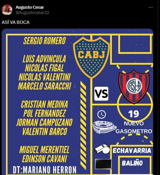 El equipo que ahora es dirigido por Mariano Herrón tras la salida de Jorge Almirón formará de la siguiente manera ante San Lorenzo (Info: Augusto César): Sergio Romero; Luis Advíncula, Nicolás Figal, Nicolás Valentini, Marcelo Saracchi; Cristian Medina, Guillermo Fernández, Jorman Campuzano, Valentín Barco; Edinson Cavani y Miguel Merentiel.