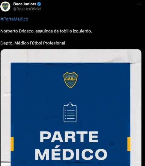 Hace rato que Boca tiene problemas con las lesiones y en esta última semana este obstáculo volvió a aparecer tras lo que habían sido días sin noticias negativas. De esta manera, se pudo dar a conocer el parte médico de Norberto Briasco, jugador xeneize que se retiró lesionado en el último partido ante Sarmiento.