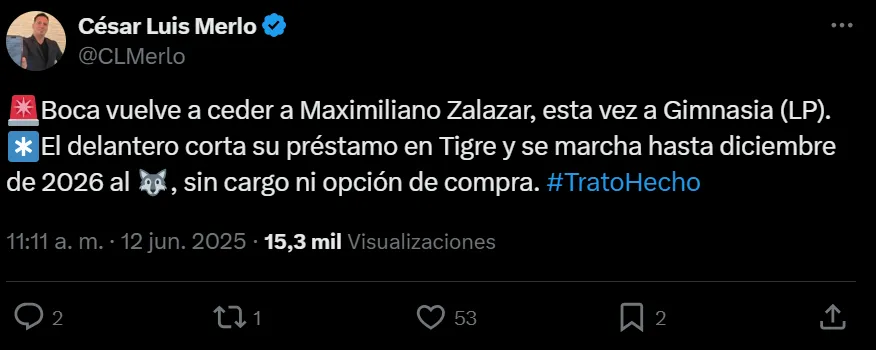 Según informó el periodista César Luis Merlo, el Xeneize volverá a prestar a Zalazar en este mercado de pases. El jugador de 24 años interrumpirá su préstamo en Tigre y vestirá la camiseta de Gimnasia de La Plata. La operación se cerró sin opción de compra y sin cargo. De esta manera, el atacante tendrá su cuarto préstamo consecutivo en lo que va de su carrera tras pasar por Platense, Barracas y Tigre.
