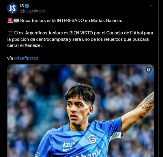 La información fue revelada por el periodista Facundo Pérez, fuente que reveló que Boca tiene bien visto a Matías Galarza en este mercado de pases. Y podría ser una alternativa para la mitad del campo en caso de que no llegue Fausto Vera.