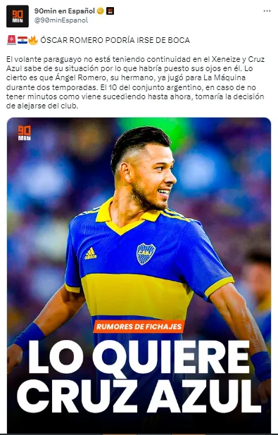 “El volante paraguayo no está teniendo continuidad en el Xeneize y Cruz Azul sabe de su situación por lo que habría puesto sus ojos en él. Lo cierto es que Ángel Romero, su hermano, ya jugó para La Máquina durante dos temporadas”, indicó el medio gráfico. Óscar tiene contrato vigente con Boca hasta el 31 de diciembre.