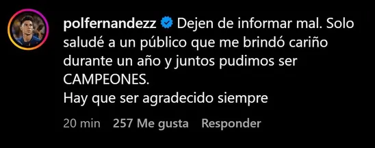 Ante la polémica que se generó, Pol se defendió. “Dejen de informar mal. Solo saludé a un público que me brindo cariño durante un año y juntos pudimos ser CAMPEONES. Hay que ser agradecido siempre”, escribió el mediocampista de 32 años en su cuenta de Instagram.