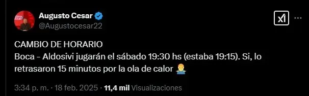 Según informó el periodista Augusto César, el encuentro entre Boca y Aldosivi del sábado 22 de febrero comenzará a jugarse a las 19:30 de la tarde. Y no a las 19:15 como estaba estipulado.