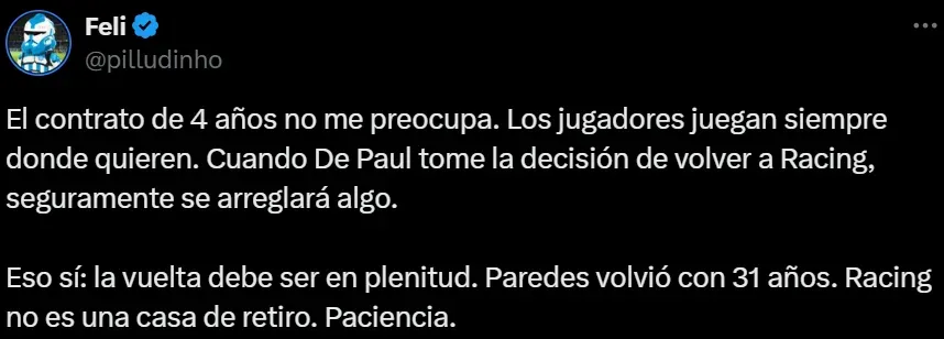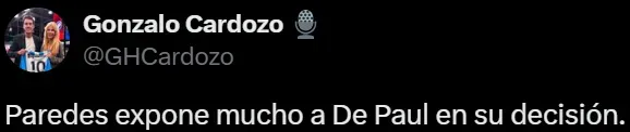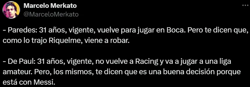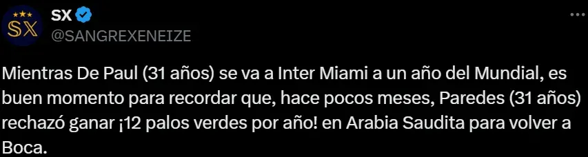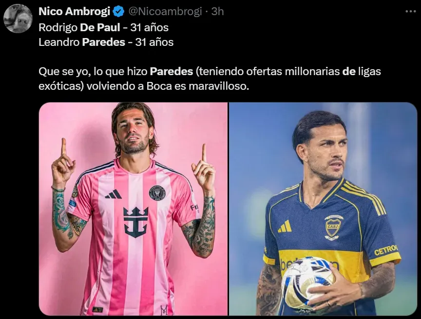 En medio de la noticia por el arribo de De Paul a la MLS, varios fanáticos del Xeneize salieron a marcar la diferencia entre ambos jugadores. “Es buen momento para recordar que Paredes rechazó ¡12 palos verdes! por año en Arabia para volver a Boca”, expresó un hincha en redes. “Que se yo, lo que hizo Paredes (teniendo ofertas millonarias de ligas exóticas) volviendo a Boca es maravilloso”, posteó otro. A su vez, un hincha de Racing, fue contundente. “Cuando De Paul tome la decisión de volver, seguramente se arreglará algo. Eso sí: la vuelta debe ser en plenitud. Paredes volvió con 31 años. Racing no es una casa de retiro”, sentenció.