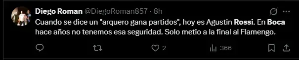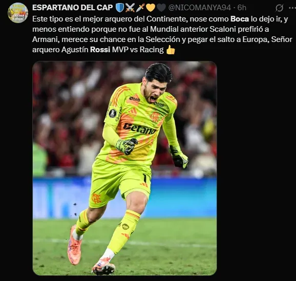 Minutos después de que finalizó el Flamengo-Racing, el nombre de Agustín Rossi fue viral en la red social de X (Twitter). Y esto se debe, en su mayoría, a los numerosos comentarios por parte de los simpatizantes de Boca hacia él. Si bien hubo diferentes opiniones acerca del arquero, casi todos lo llenaron de cumplidos y dejaron en claro que quieren verlo nuevamente en el arco Xeneize.