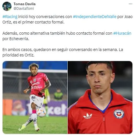 Esto también está vinculado a las incorporaciones y se debe a que la Academia inició conversaciones por un futbolista del conjunto ecuatoriano. El periodista Tomás Dávila brindó más detalles y confirmó que, desde Avellaneda, están interesados en Joao Ortiz y ya se dio el primer contacto formal.