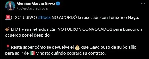 Mientras que el periodista Germán García Grova agregó en TyC Sports: “No se arregló porque no lo llamaron. Desde el día que le comunicaron que fue despedido, Gago no recibió ninguna comunicación de Boca para juntarse. Gago pide que lo llamen. Ese dinero no está resuelto como se lo van a devolver. Hasta que no se registre la salida de Gago, no pueden firmar a un nuevo entrenador”.