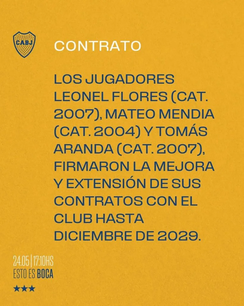 Con la participación de Boca terminada en el Torneo Apertura, el Xeneize ya se enfoca en el mercado de pases que se viene en junio. En ese sentido, se prevén algunas llegadas y salidas, así como también renovaciones. Y donde ya hubo fue en los juveniles. El club quiere blindar a las joyas de Boca Predio para evitar perder dinero por lo que empezó con tres futbolistas: Mateo Mendía, Leonel Flores y Tomás Aranda.