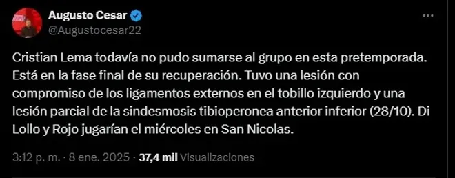 Según reveló el periodista Augusto César en su cuenta de “X” (Twitter), Cristian Lema todavía no se recuperó totalmente de su lesión en el tobillo. Y todavía no pudo entrenar a la par de sus compañeros en la pretemporada.