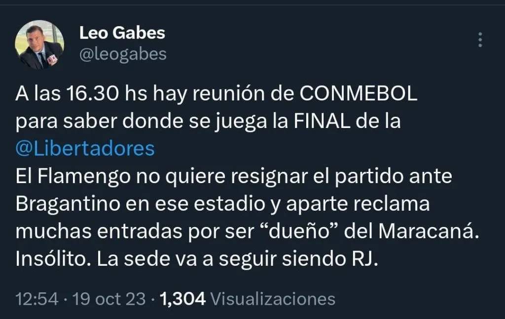 Al respecto, siempre con base en el medio citado anteriormente, Alejandro Domínguez, autoridad máxima de Conmebol, ya le habría manifestado a Ednaldo Rodrigues, presidente de la Confederación Brasileña de Fútbol, que de no solucionarse este tema en las próximas horas, le quitará al Maracaná la posibilidad de albergar el último encuentro de la Copa Libertadores 2023.