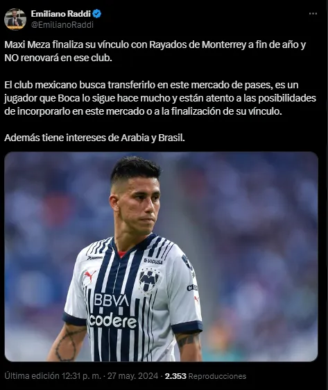 El año pasado Boca hizo un intento por traer a Maxi Meza para la Copa Libertadores, pero terminó renovando su vínculo con Rayados de Monterrey. Justamente, ese contrato vence a fines de 2024 y se supo que no renovará y le buscarán salida en este mercado de pases para que no se vaya libre.