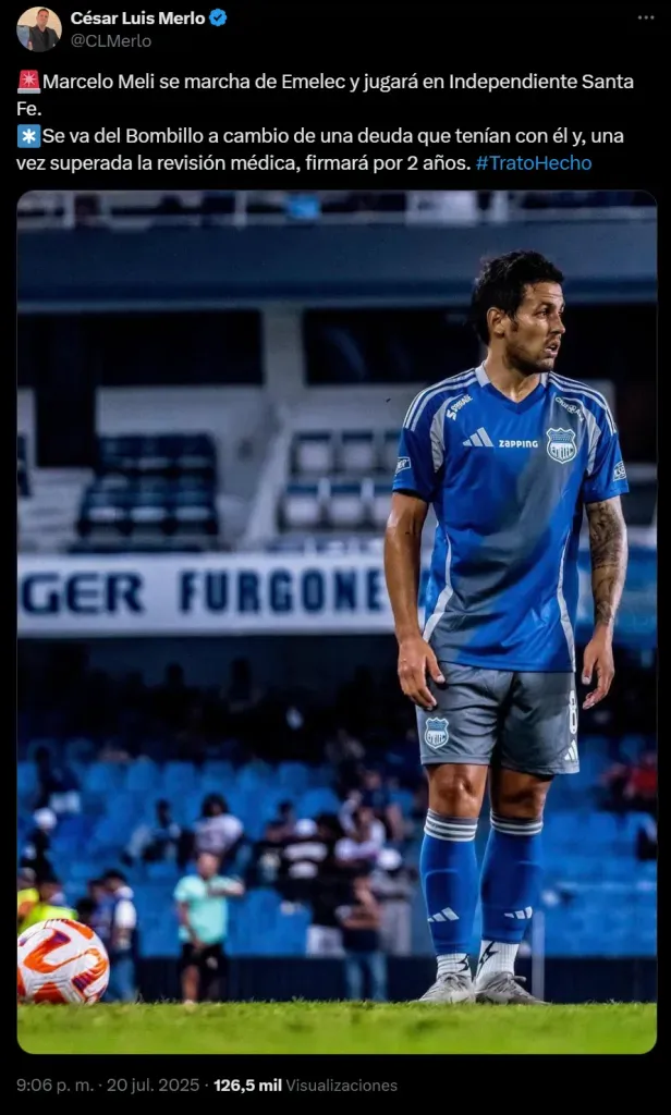 Meli llegó a Emelec a principios del 2024. Luego de un año y medio, donde se convirtió en figura y pudo tener regularidad, terminó arreglando su llegada a Independiente Santa Fe. El mediocampista argentino llega al actual campeón colombiano luego de haber acordado su salida del equipo “Eléctrico” a cambio de saldar la deuda pendiente que mantenían con él.