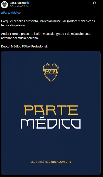 Según reveló el periodista Emiliano Raddi de Planeta Boca Juniors, el español sufrió una lesión muscular en el recto anterior del muslo derecho, parecida a la de Exequiel Zeballos. Tendrá, como mínimo, entre 2 y 3 semanas sin jugar.