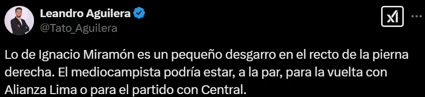 El periodista Leandro Aguilera reveló en su cuenta de X (Twitter) que el mediocampista tuvo un pequeño desgarro en el recto de su pierna derecha. A su vez, la fuente citada señaló que el posible regreso del futbolista podría ser para la vuelta ante Alianza Lima o para el partido ante Central Córdoba de Santiago del Estero. De esta manera, el volante regresaría entre el 25 de febrero y el 7 de marzo.