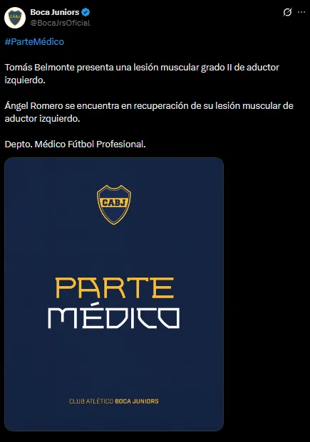 En las últimas horas, Boca sacó un comunicado anunciando una lesión muscular grado II de Tomás Belmonte. Por esta razón, el futbolista no será convocado para el partido con San Lorenzo y podría estar afuera entre 3 y 4 semanas.