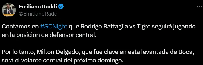 Emiliano Raddi, periodista de Planeta Boca Juniors, reveló que el ex Atlético Mineiro se posicionó de defensor central en la última práctica, tal como lo venía haciendo con Gago. De esta manera, Delgado siguió estando en la mitad de la cancha del equipo titular. Por lo que todo indica que el joven futbolista será el volante central del conjunto de la Ribera en el próximo partido y no saldrá del once inicial como se pensaba.