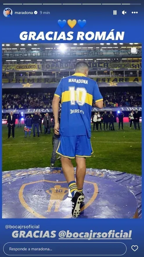 Quienes llevan adelante el manejo de las redes sociales de Diego subieron una imagen acompañada por un “GRACIAS ROMÁN” y un “GRACIAS BOCA”, más corazones azules y amarillos, dejando en claro lo bien que cayó el gesto del vice boquense.
