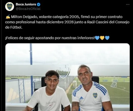 En el mes de febrero, Milton Delgado firmó su primer contrato profesional con Boca. El vínculo quedó establecido hasta diciembre del 2028 y así lo comunicó el club xeneize: “Firmó su primer contrato hasta diciembre de 2028. ¡Felices de seguir apostando por nuestras inferiores“.