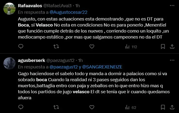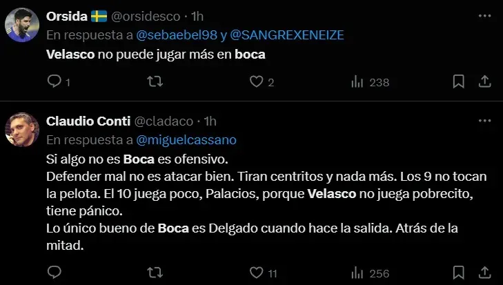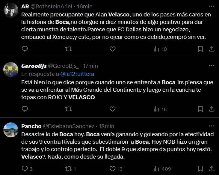 “Es preocupante“, “Velasco no puede jugar más en Boca“, “No lo puedo ver más“, fueron algunos de los comentarios de los fanáticos del Xeneize. Hubo muchísima bronca para con el ex Independiente, que desde que llegó no pudo tener un buen rendimiento en el club.
