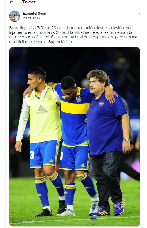 “Habitualmente esa lesión demanda entre 45 y 60 días. Entró en la etapa final de recuperación, pero aún así es difícil llegue al Superclásico”, marcó el periodista Ezequiel Sosa sobre la situación del colombiano. Mientras tanto, Valentín Barco volvería a ser titular contra Racing y buscará una rápida llegada luego del partido ante Rosario Central donde fue sustituido en el entretiempo.