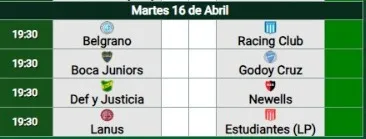 Boca (5°) recibirá a Godoy Cruz (1°) en La Bombonera, mientras que Belgrano enfrentará a Racing (6°) en Córdoba. Por su parte, Estudiantes (2°) y Lanús (3°) se verán las caras en La Fortaleza y, por último, Defensa y Justicia (4°) se enfrentará a Newell’s (7°) en Florencio Varela.