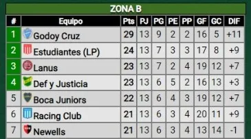 Con el partido que se dio en La Plata entre Boca y Estudiantes, la tabla de posiciones en la Zona B sufrió algunas modificaciones y este martes 16 se conocerán a los cuatro clasificados a los playoffs, instancia que se dará unos días después. Los cuartos de final se disputarán el sábado 20 y domingo 21. Aquellos que resulten ganadores de estos cruces, jugarán las semifinales el domingo 28.