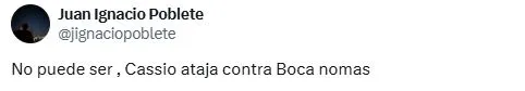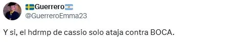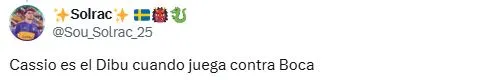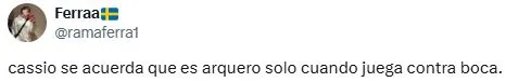El arquero, quien eliminó al Xeneize en octavos de final, no mostró un buen nivel ante la Academia y los simpatizantes del Único Grande no ocultaron su bronca. “Cassio se acuerda que es arquero solo cuando juega contra Boca“, “Cassio es el Dibu cuando juega contra Boca” o “No puede ser, Cassio ataja contra Boca nomas“, fueron algunos de los comentarios en “X” (Twitter).