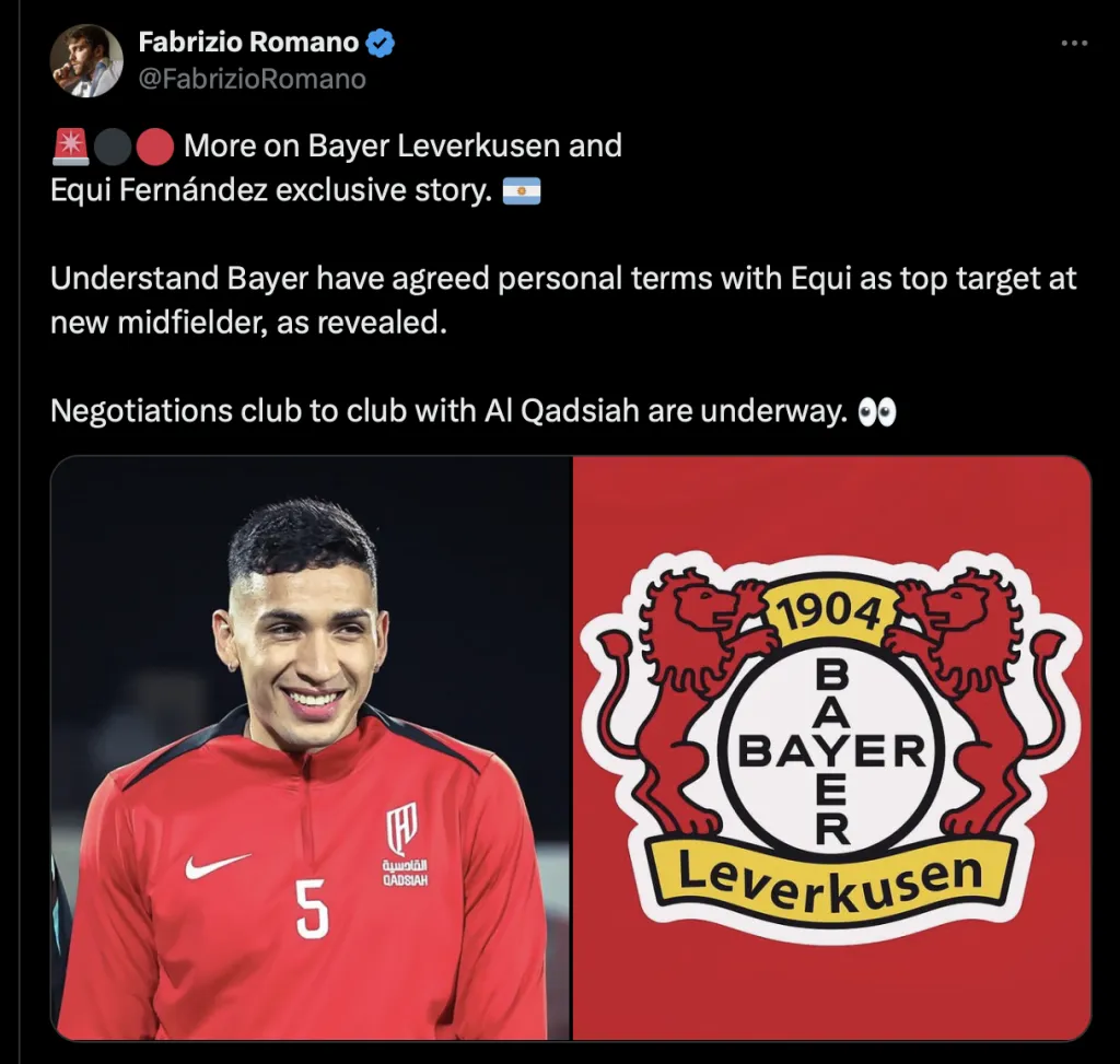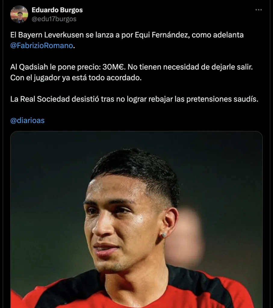 En este sentido, el reconocido periodista contó en Twitter: “Más sobre el Bayer Leverkusen y la historia exclusiva de Equi Fernández. Se entiende que el Bayer ya llegó a un acuerdo en los términos personales con Equi, quien es el principal objetivo para reforzar el mediocampo, tal como se había adelantado. Actualmente, están en marcha las negociaciones entre clubes con Al Qadsiah“.