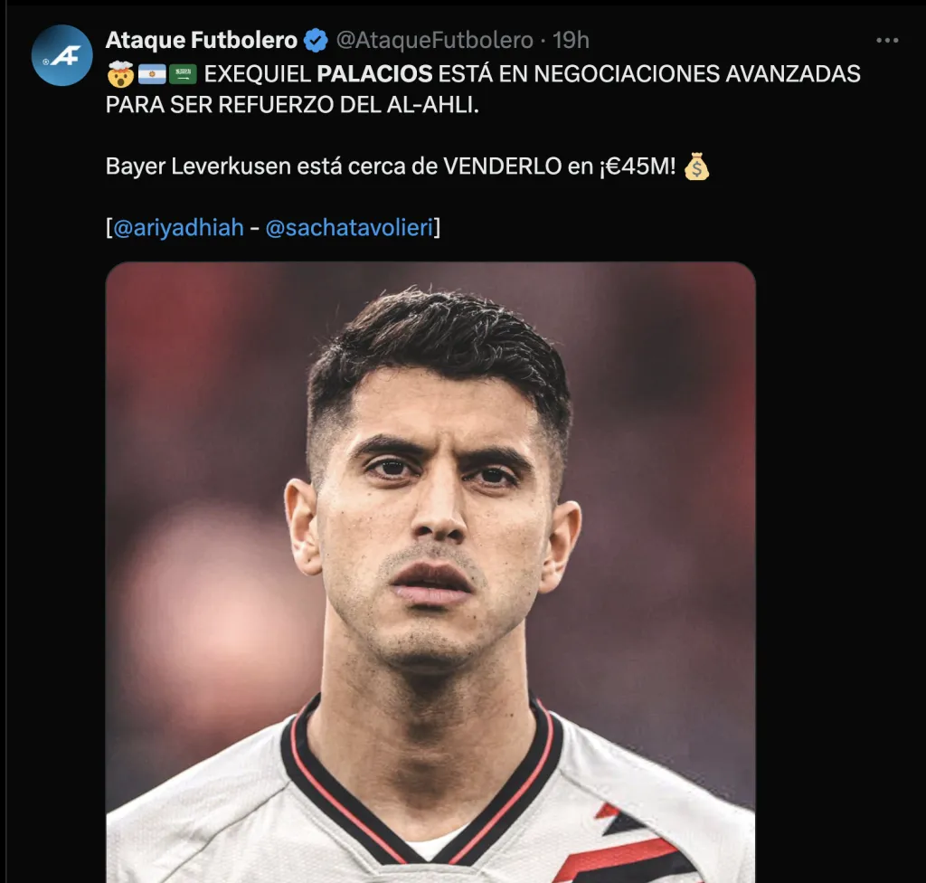 Hace unas horas, surgió la información de que Exequiel Palacios tiene chances de dejar el Bayern Leverkusen. Esto, ante el interés del Al-Ahli de Arabia Saudita que lo pretende según informaron desde los medios del país asiático.