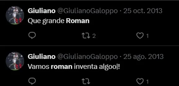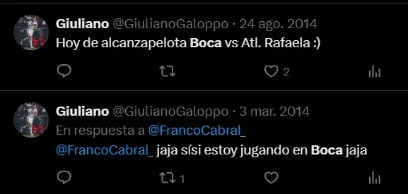 A través de su cuenta de Twitter oficial, se pudieron dar a conocer tuits viejos de Giuliano Galoppo sobre Boca. La gran mayoría tiene más de 10 años y se remontan al momento en el que el volante se encontraba realizando inferiores en el club de la Ribera.