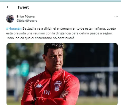 Los dirigentes no están contentos con el desempeño de Seba al mando del conjunto de Parque Patricios. Y tomarían cartas en el asunto. “Battaglia va a dirigir el entrenamiento de esta mañana. Luego está prevista una reunión con la dirigencia para definir pasos a seguir”, contó el periodista Brian Pécora. Y aseguró: “Todo indica que el entrenador no continuará”.