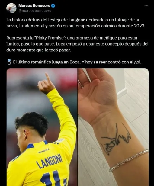 La información fue revelada por el periodista Marcos Bonocore en su cuenta de Twitter, fuente que confirmó que el festejo de Luca Langoni tras su gol ante Newell’s fue dedicado especialmente para su pareja, Agustina López.