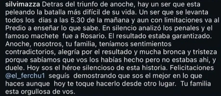 “Detrás del triunfo de anoche, hay un ser que está peleando la batalla más difícil de su vida. Un ser que se levanta todos los días a las 5.30 de la mañana y aun con limitaciones va al Predio a enseñar lo que sabe. En silencio analizó los penales y el famoso machete fue a Rosario”, comenzó este posteo en Instagram.