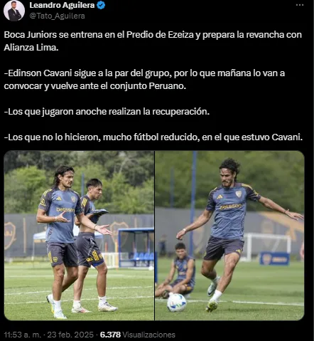 Uno de los jugadores con los que espera contar es con Edinson Cavani, quien tiene una pequeña fractura al costado de una vértebra y lleva cuatro partidos sin jugar. Según reveló el periodista Leandro Aguilera de TyC Sports, el uruguayo se entrenó a la par del grupo en este domingo y lo convocarán para el duelo ante Alianza Lima del martes.