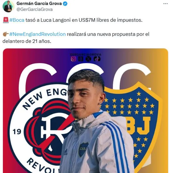 Según informó el periodista Germán García Grova, tasó a Luca Langoni en 7 millones de dólares libres de impuestos. Además, mencionó que New England Revolution, quien lo tiene en carpeta, realizará una nueva propuesta. Cabe destacar que esta cifra es aproximadamente la mitad de su cláusula de rescisión, fijada en 15 millones de dólares.