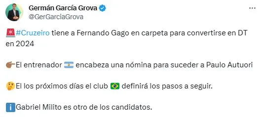 La suspensión de las elecciones cambió el panorama por completo y por el momento, Boca sigue en tratativas por el nuevo entrenador. Bajo un contexto judicial, el Xeneize aún no confirmó al sucesor de Jorge Almirón. Lo cierto es que los candidatos a tomar las riendas del plantel son varios y dentro de la lista aparecen nombres como los de Fernando Gago y Gabriel Milito, quienes ya están en la mira de Cruzeiro.