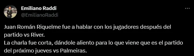 Además, este hecho ha sido confirmado también por el periodista Emiliano Raddi. En su cuenta de Twitter, aclaró que la charla de los protagonistas no duró demasiado y Riquelme les otorgó palabras de aliento para el duelo del próximo jueves ante el Verdao.