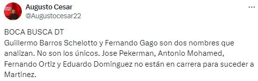 Según informó el periodista Augusto César, los entrenadores que no están en carrera para suceder a Martínez son José Pekérman, Antonio Mohamed, Fernando Ortíz y Eduardo Domínguez. A su vez, mencionó que hay dos nombres que sí son analizados por las autoridades y se tratan de dos exBoca: Guillermo Barros Schelotto y Fernando Gago, aunque destacó que no son los únicos.