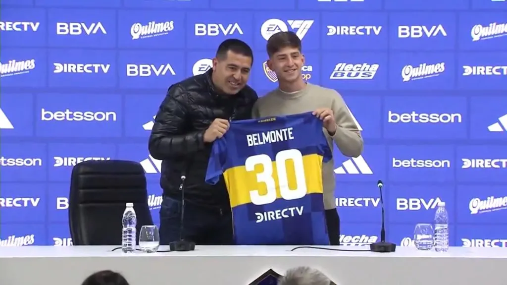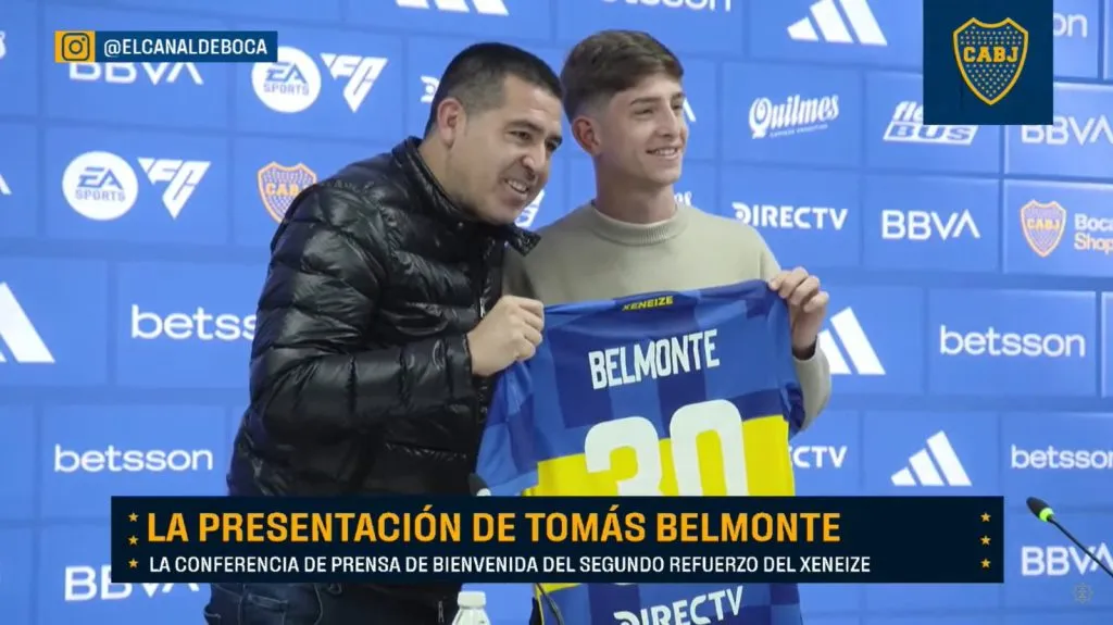 Tomás Belmonte se convirtió en el segundo refuerzo de este mercado de pases y este lunes fue presentado oficialmente como nuevo jugador de Boca. El volante no estuvo solo. Como suele suceder en cada una de estas presentaciones, Juan Román Riquelme estuvo presente y le dio la bienvenida a Toto. Además, el presidente sorprendió con un hecho que llamó la atención de todos.