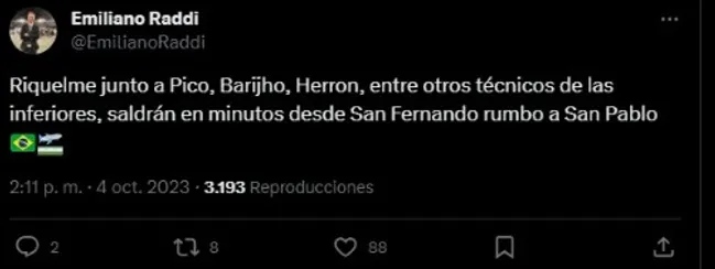 Viajando en un vuelo privado a San Pablo, Riquelme estará presente en el partido de Boca vs. Palmeiras junto a Walter Pico, “Chipi” Barijho y Mariano Herrón, entrenadores de divisiones inferiores del xeneize.